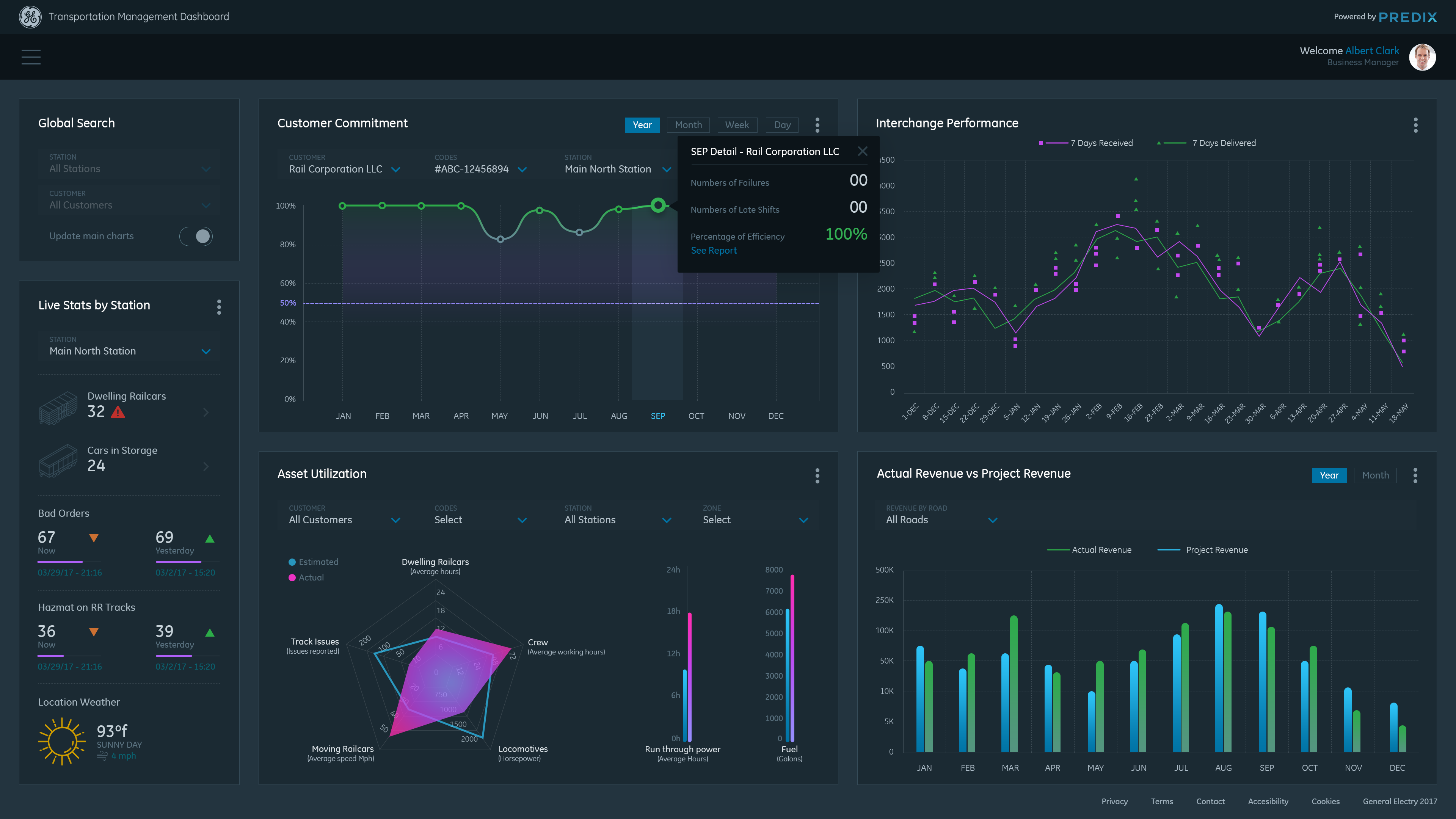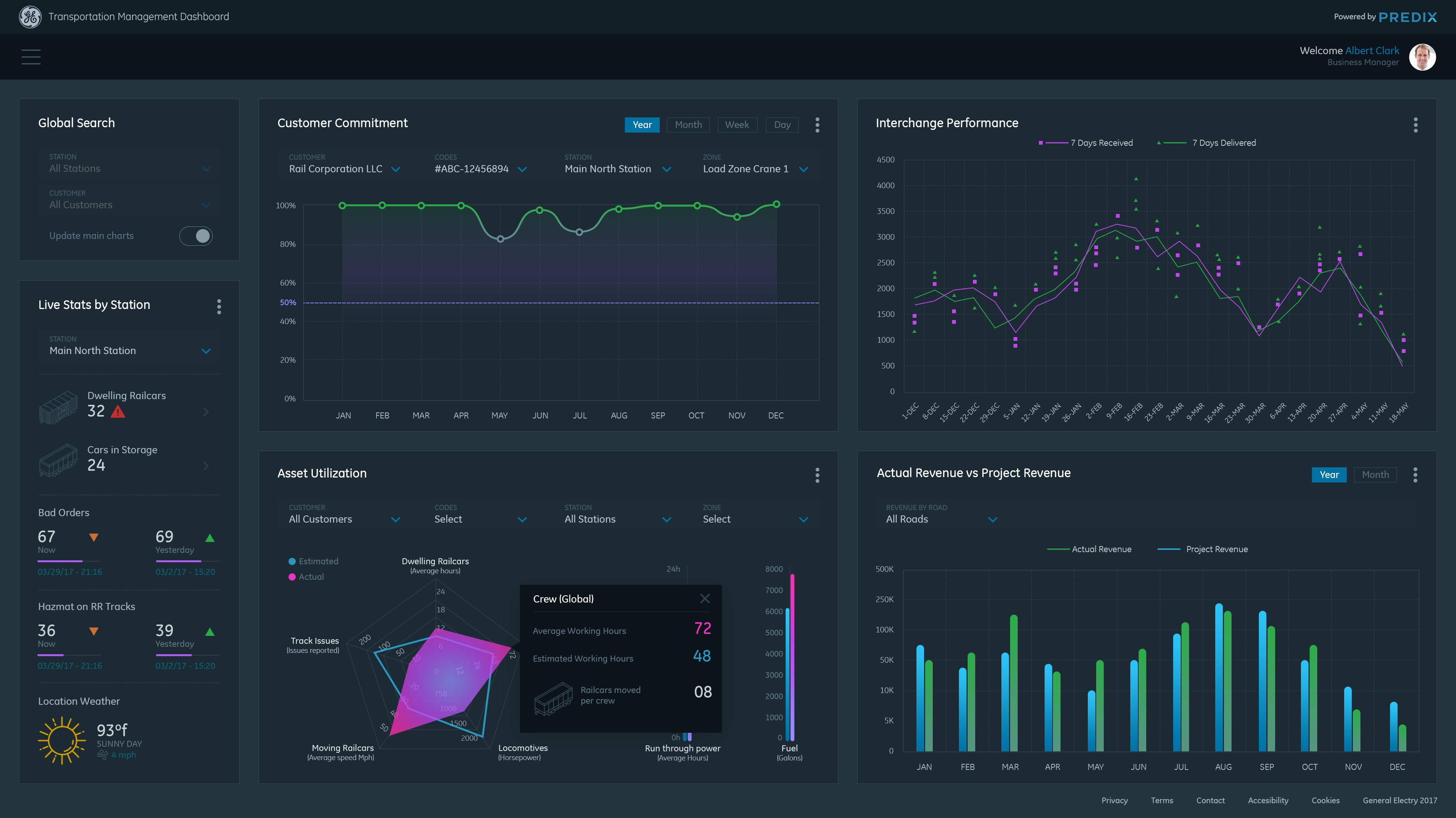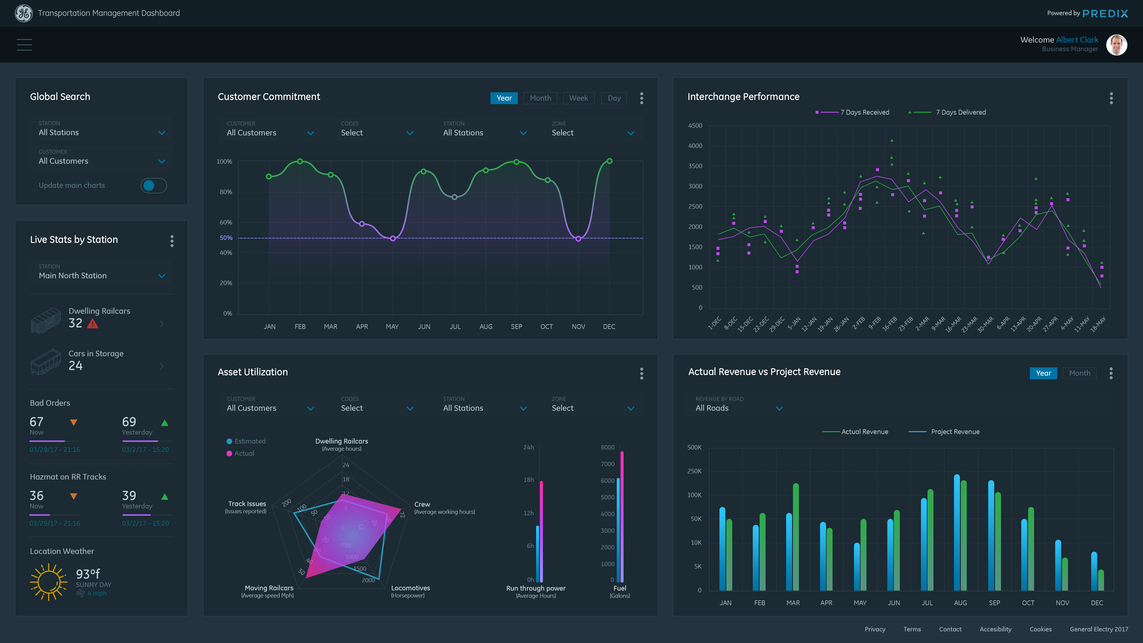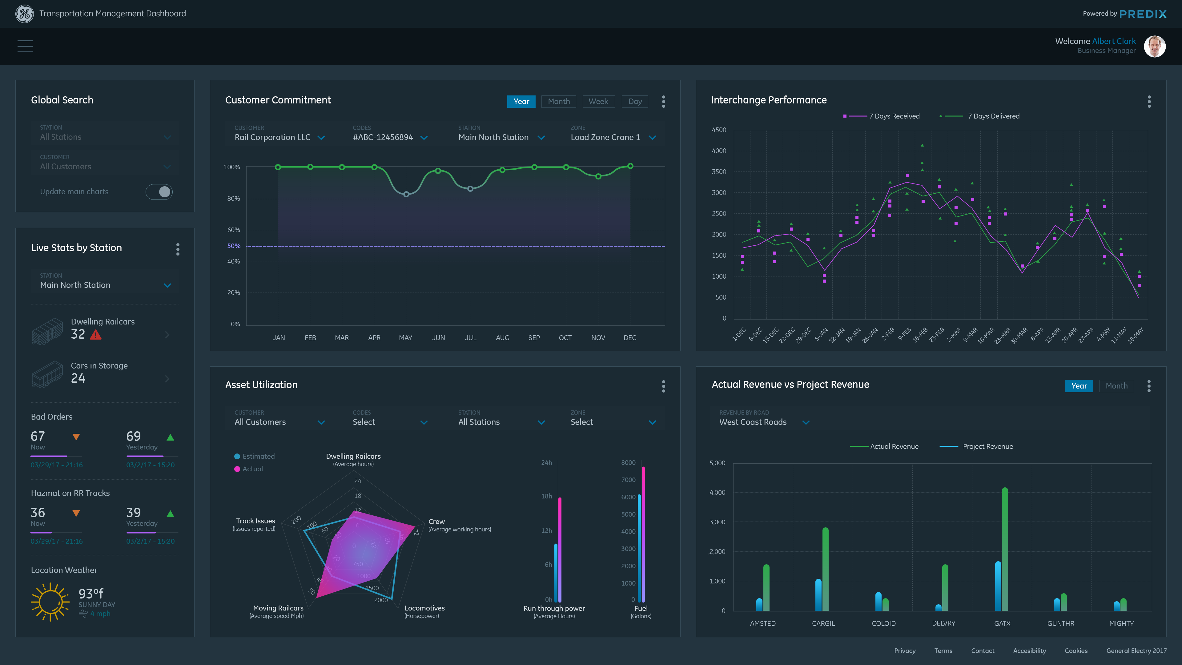 Data Visualization Dashboard concept for General Electric Transportation Management System (TMS) application. TMS is software that enables railroad companies to control the end to end operations of receiving and delivering railcars to their customers. Goals for the dashboard: To have visually distinctive representations of historical data to help the Business and Operations Managers monitor and detect trends in their railroad(s)' performance, so they can make smarter decisions about future business and to better serve their customers.