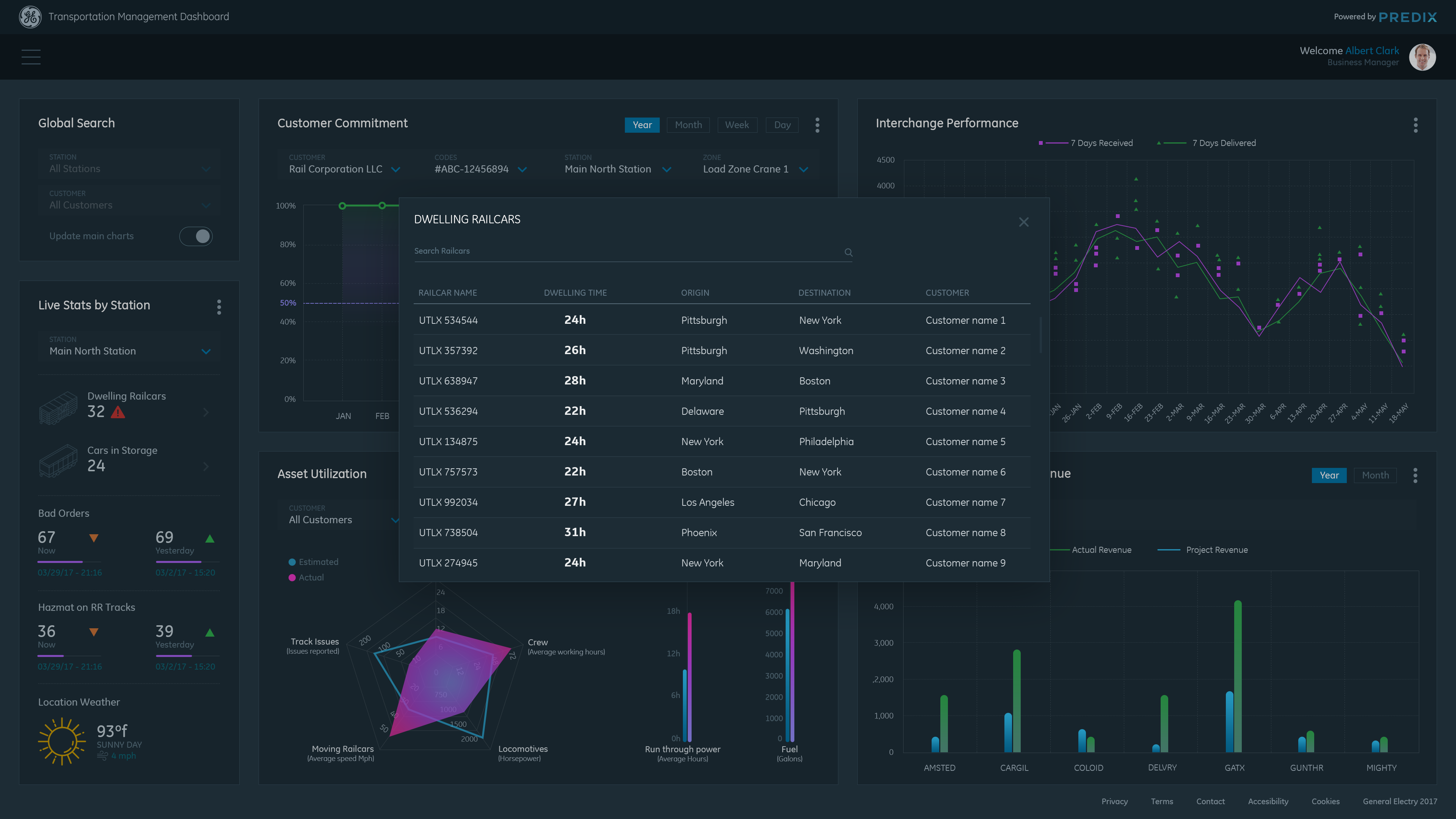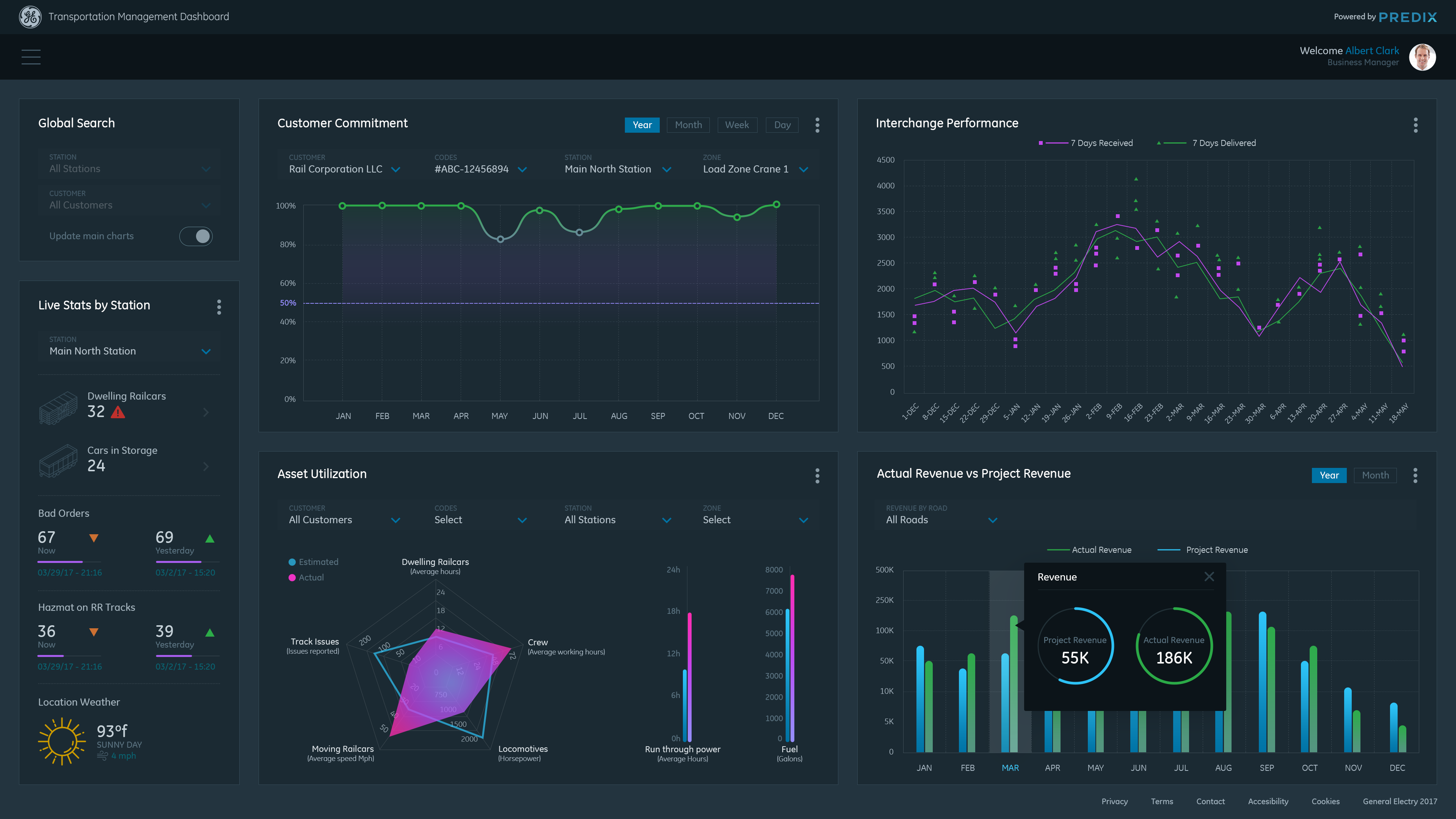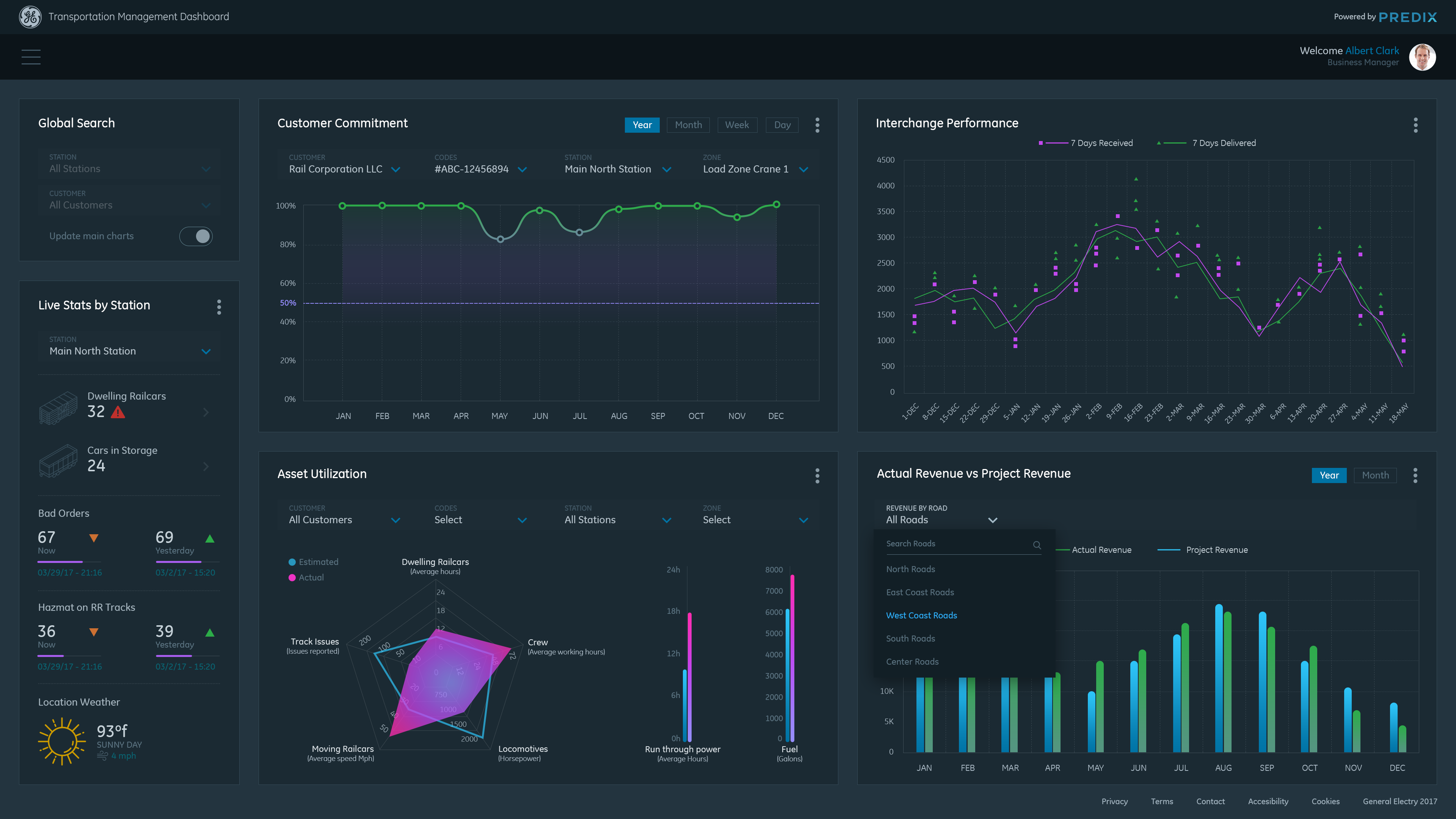 Data Visualization Dashboard concept for General Electric Transportation Management System (TMS) application. TMS is software that enables railroad companies to control the end to end operations of receiving and delivering railcars to their customers. Goals for the dashboard: To have visually distinctive representations of historical data to help the Business and Operations Managers monitor and detect trends in their railroad(s)' performance, so they can make smarter decisions about future business and to better serve their customers.