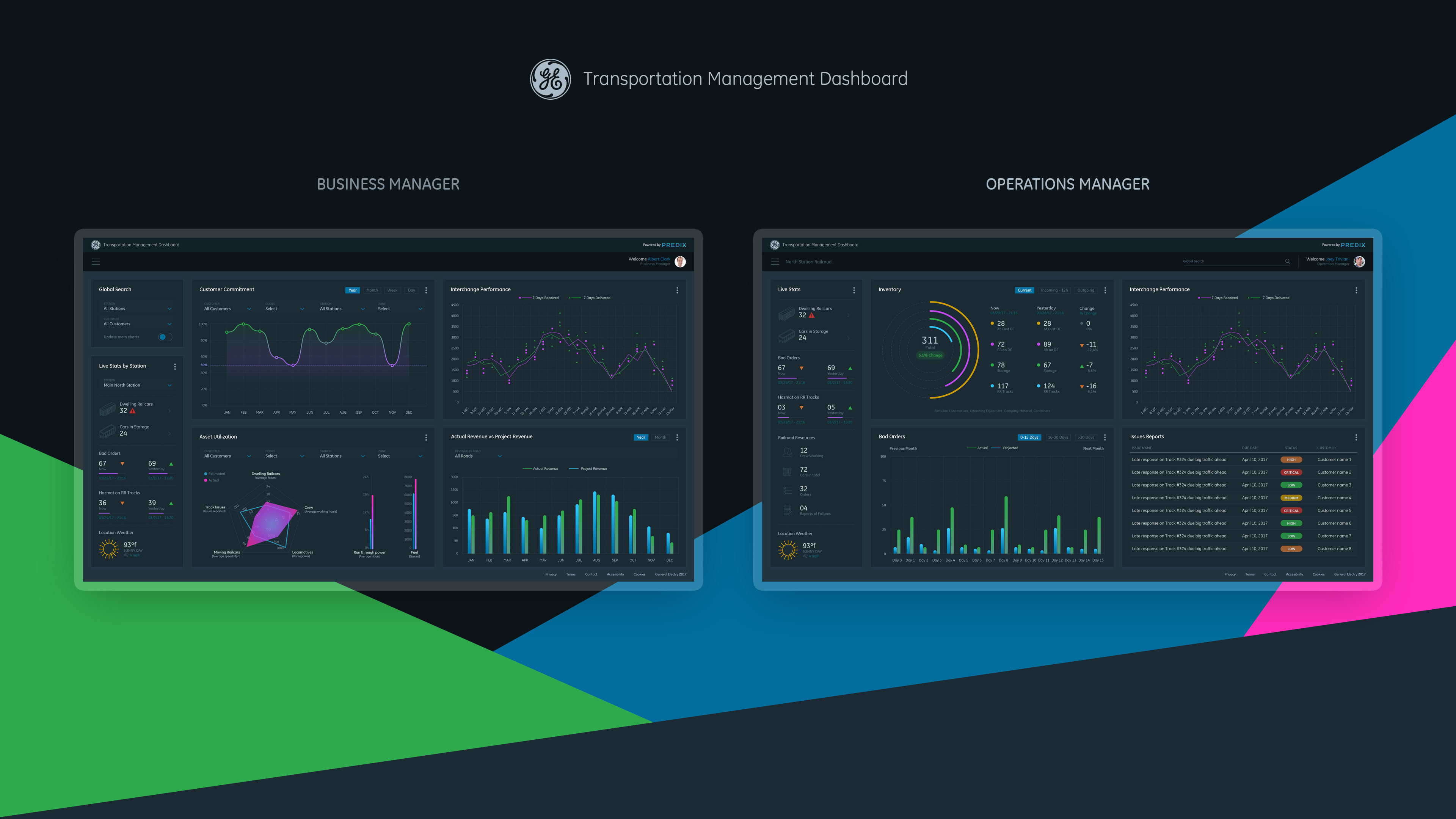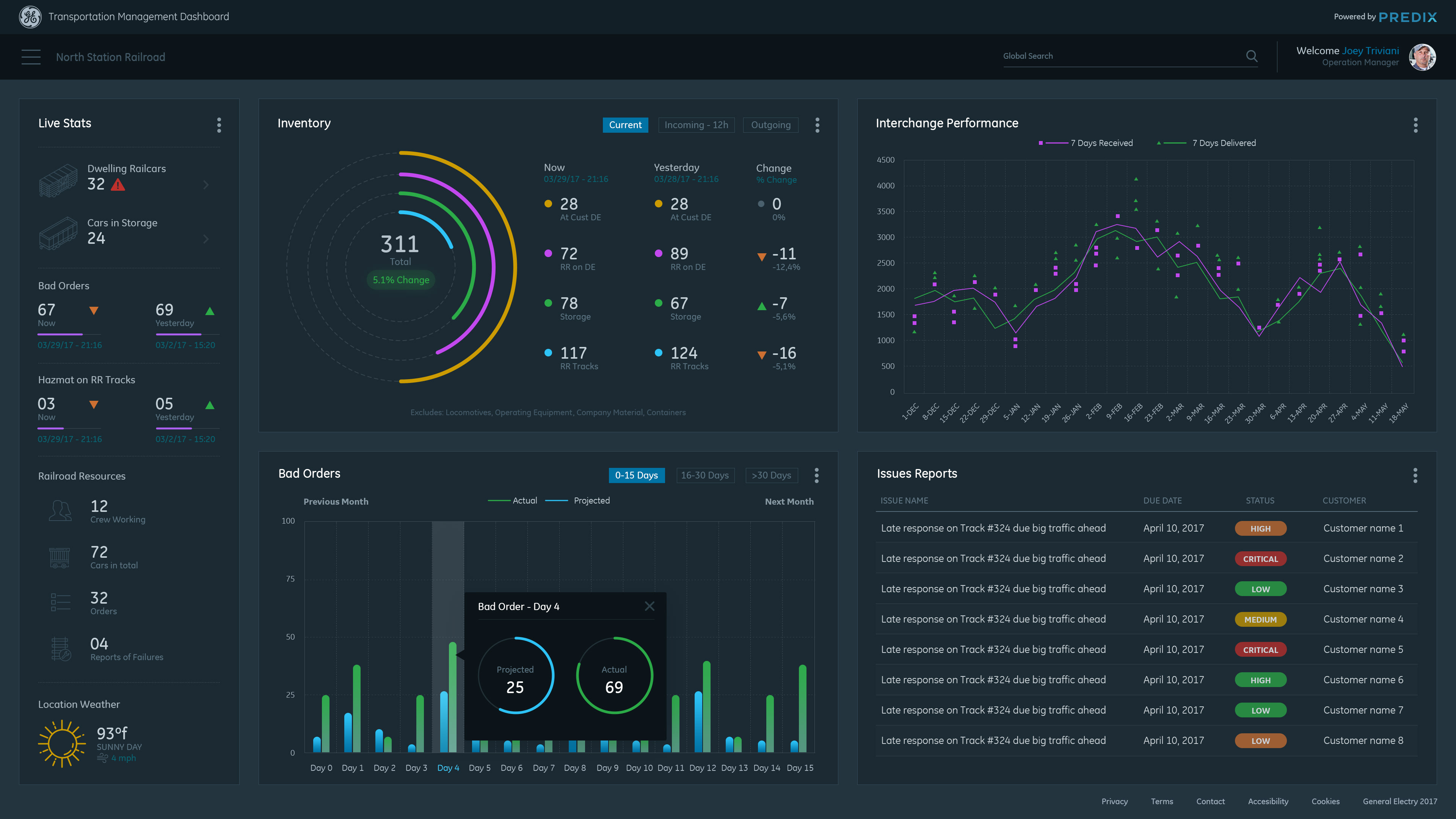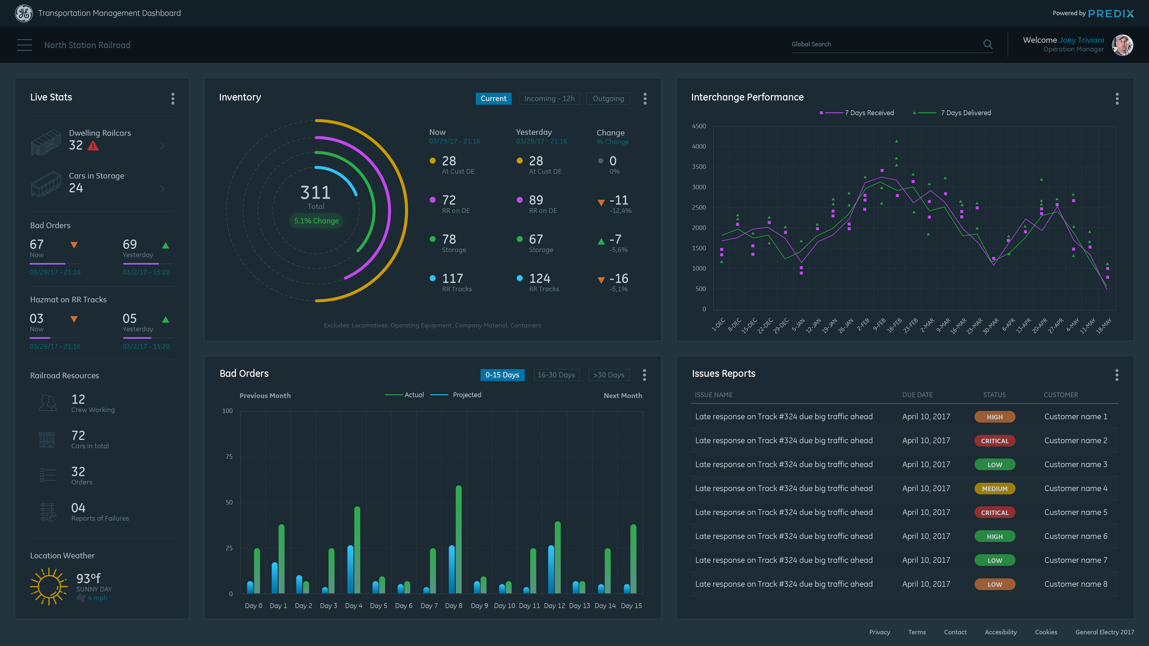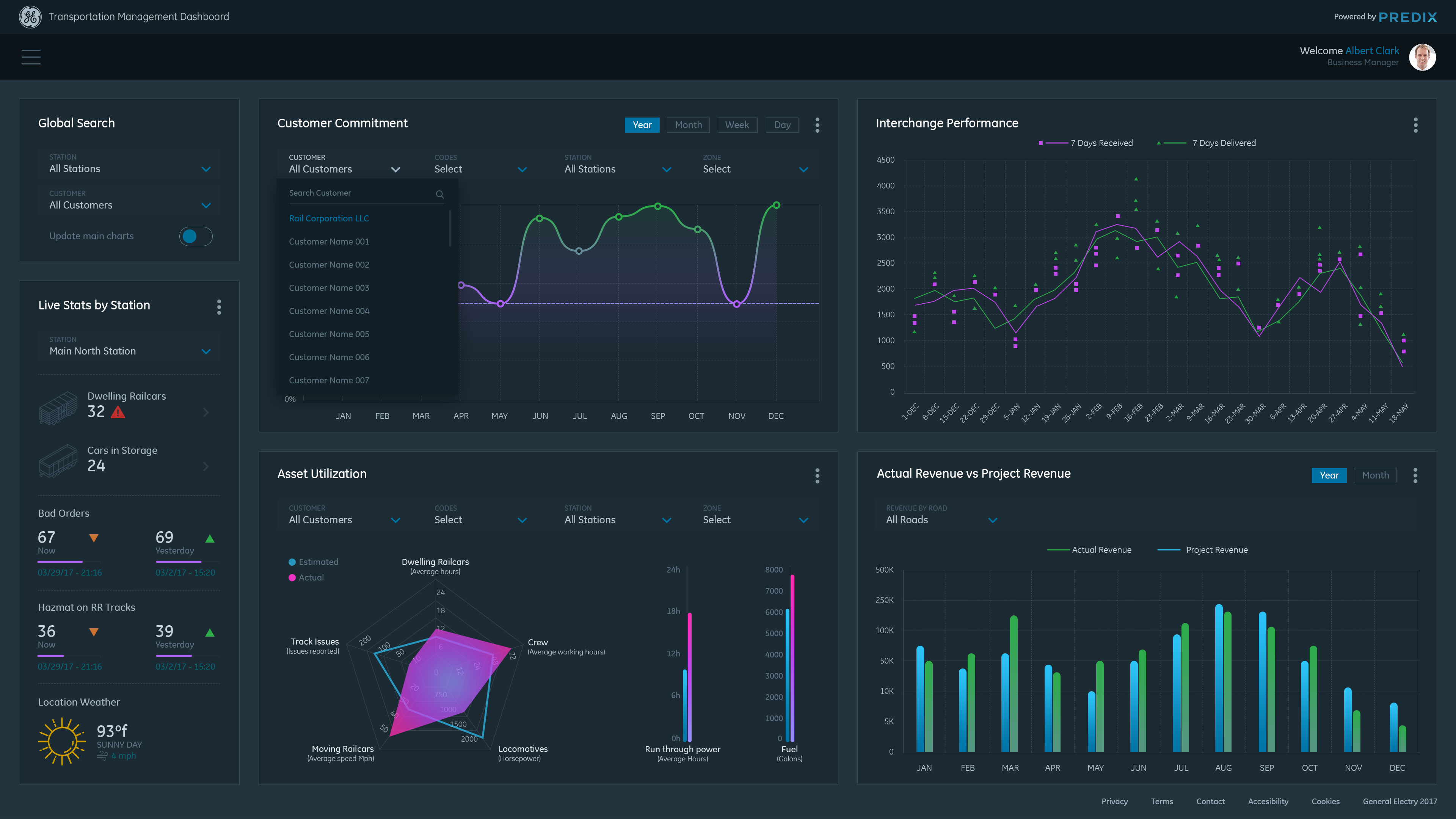 Data Visualization Dashboard concept for General Electric Transportation Management System (TMS) application. TMS is software that enables railroad companies to control the end to end operations of receiving and delivering railcars to their customers. Goals for the dashboard: To have visually distinctive representations of historical data to help the Business and Operations Managers monitor and detect trends in their railroad(s)' performance, so they can make smarter decisions about future business and to better serve their customers.