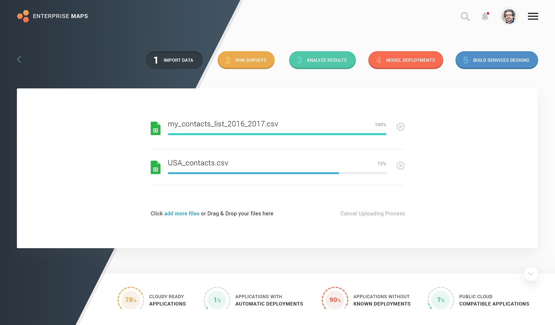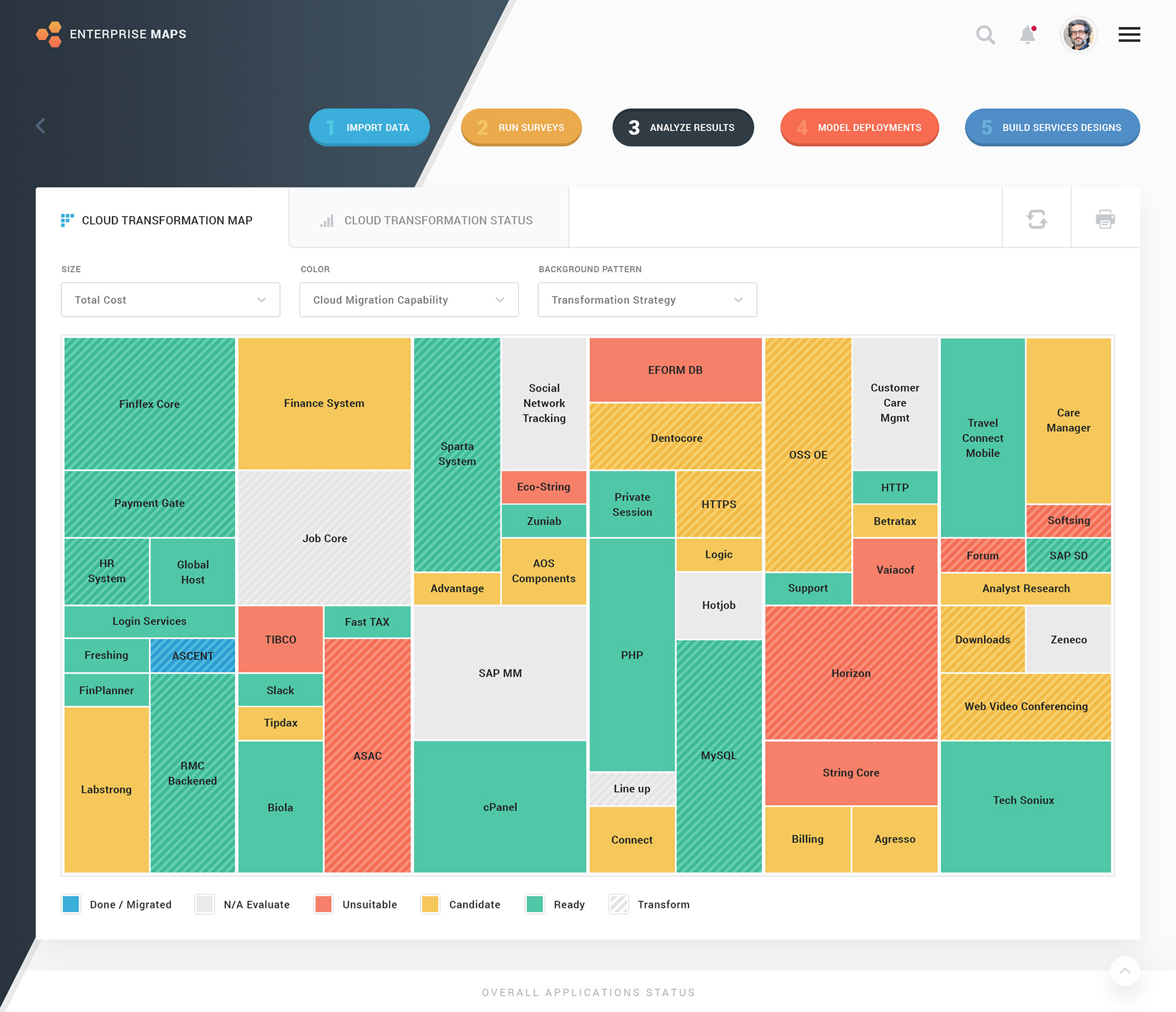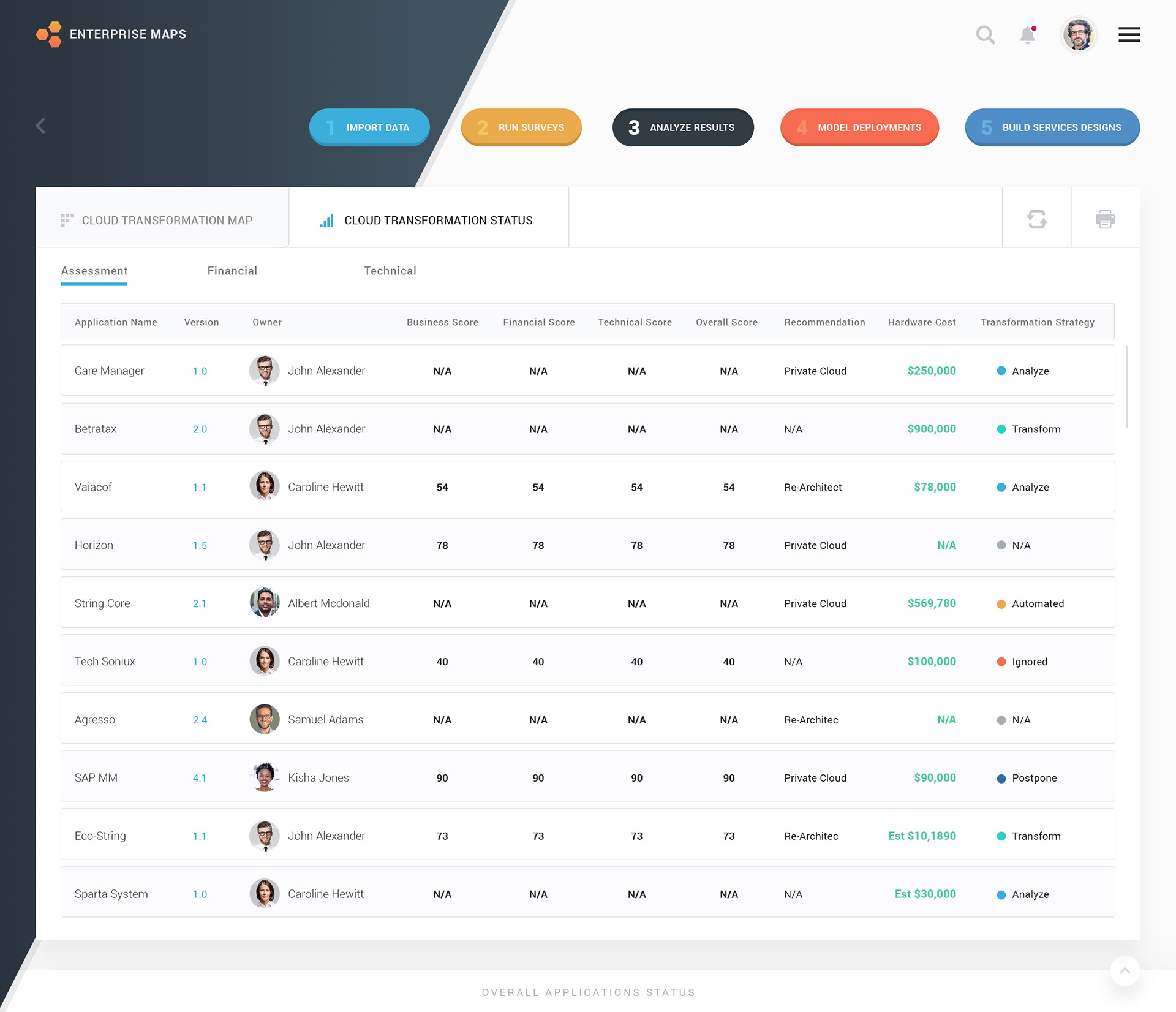 Redesign, enhance, and improve of the UI/UX of IBM Cloud Assessment & Transformation Tool, a responsive application which is also called as Enterprise Maps (EM) by IBM. Project Goals: - Redesigning and improve the UI/UX of selected screens from EM Tools - Simplify the flow and make decision simple yet powerful which can be by adding any other data source (if required) and be plotting the data in a better way. Managing transformation. - Command map and govern enterprise architecture in graphical and tabular format. - Helps in identifying cloud transformation use case. - Helps determine which app is cloud-ready and which are not based on 5 steps process. Click on any image to access the prototype.