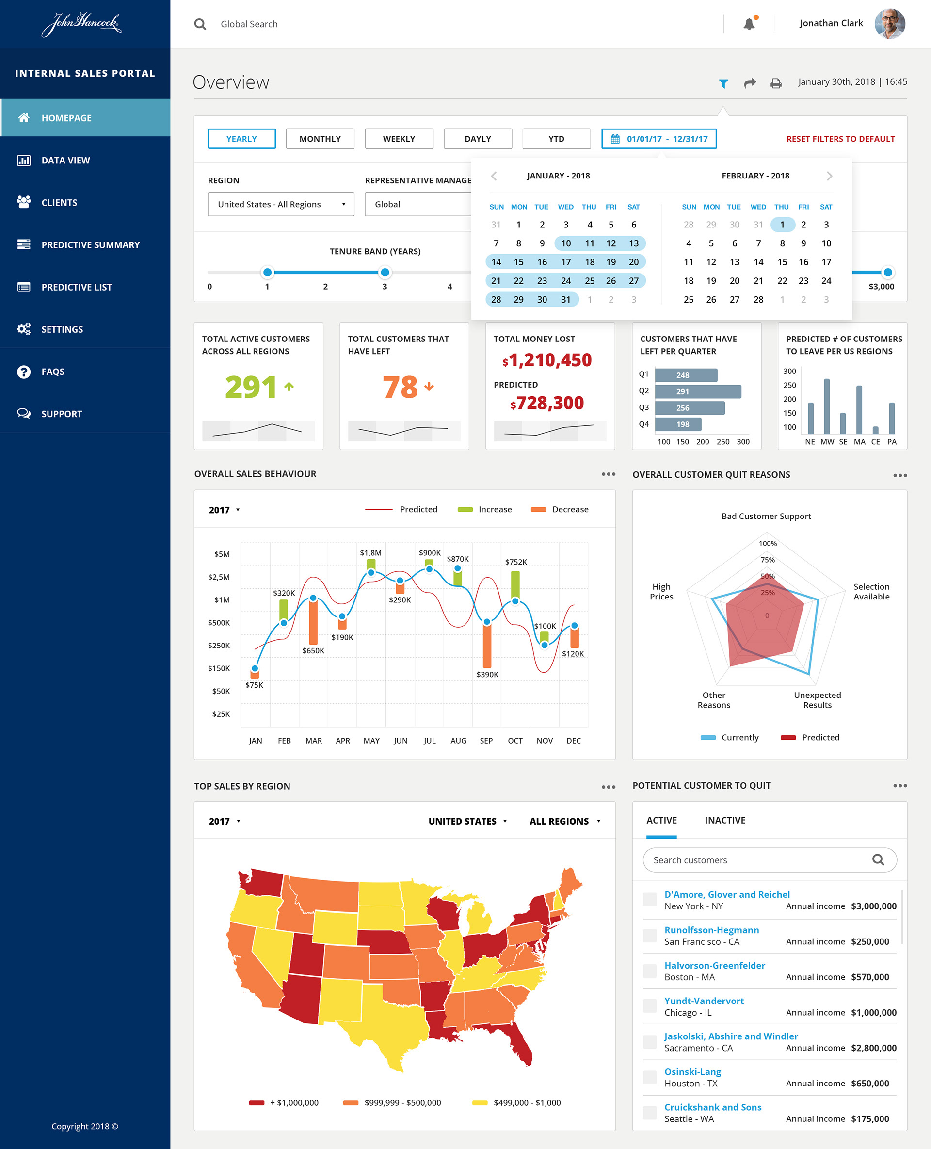UI/UX design for an internal web portal used by John Hancock to analyze its customers. This portal would show historical metrics on the customers as well as predictive statistic results with recommended areas for action. This portal would show historical metrics on the customers as well as predictive statistic results with recommended areas for action.